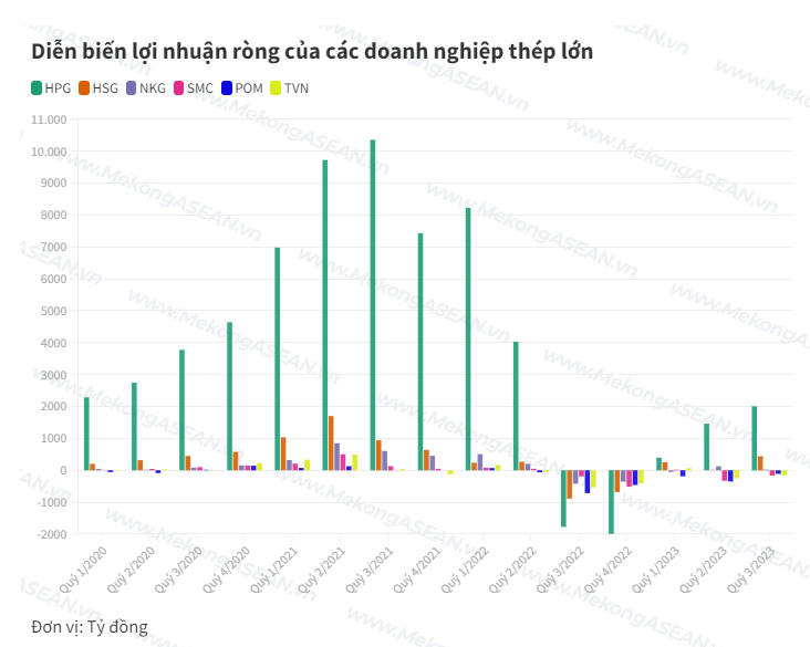 Gang thép Thái Nguyên (TIS), Thép Vicasa (VCA), Thép Thủ Đức (TDS), Thép Nhà Bè (TNB), Gang thép Cao Bằng (CBI) cũng đều báo lỗ trong quý 3/2023. Số ít doanh nghiệp thép nhỏ báo lãi gồm Kim khí TP HCM (HMC), Ống thép Việt Đức VG PIPE (VGS) và Thép Tiến Lên (TLH).